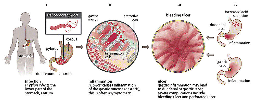Рис.2 Схема внедрения (инфицирования) Хеликобактер пилори: (i) расположение инфекции в желудке - инфицирует нижние отделы желудка (антрум); (ii) инфекция вызывает воспаление слизистого слоя желудка (гастрит), часто протекает беcсимптомно; (iii) воспаление может приводить к образованию язв в желудке и двенадцатиперстной кишке