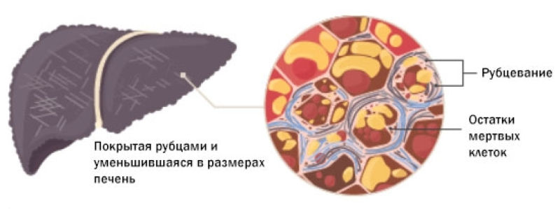 В отсутсвие лечения и при дальнейшем прогрессировании воспаления печень будет самостоятельно пытаться восстановить поврежденную ткань. Этот процесс может протекать недостаточно эффективно (особенно если очагов воспаления много) и на месте воспаленных клеток будет накапливаться соединительная ткань, образовывая своеобразный рубец. Очаги рубцовой ткани в печени называются фиброзом.