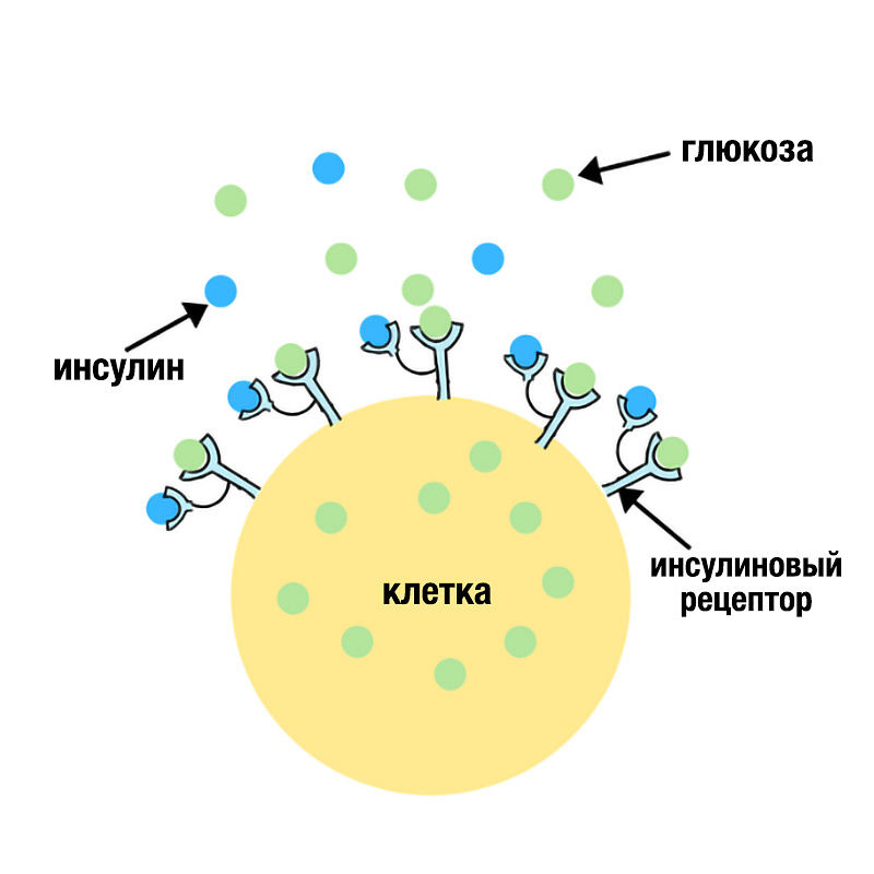 Для того чтобы глюкоза попала в клетку, где она будет преобразована в энергетические молекулы АТФ, инсулин должен связаться с рецептором на мембране клетки. Взаимодействуя с рецептором инсулин, как ключ, открывает проход глюкозе в клетку. Без инсулина глюкоза не сможет проникнуть в клетку и ее уровень в крови будет оставаться высоким (механизм развития сахарного диабета 1 типа).