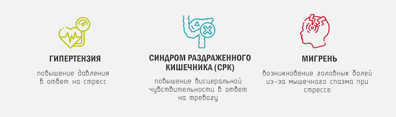 Стресс также может привести к эмоциональным и психическим симптомам, таким как чувство подавленности, тревожность или раздражительность, депрессия. Некоторые люди более чувствительны к стрессу как в эмоциональном, так и в физическом плане. И у них может быть выше вероятность развития психосоматических расстройств на фоне стресса. В результате развиваются различные изменения в организме — нарушается баланс вегетативной нервной системы, что приводит к изменению в гипоталамо-гипофизарно-надпочечниковой (ГГН) оси. В результате, как реакция на стрессовые гормоны повышается артериальное давление, учащается сердцебиение и затрудняется дыхание, повышается уровень глюкозы (сахара) в крови. При длительном стрессе происходит снижение регенеративной (восстановительной) активности организма, изменения в работе ЖКТ, уменьшение притока крови к префронтальной коре головного мозга (отвечает за исполнительные функции, такие как концентрация внимания, контроль импульсов и эмоциональная регуляция).