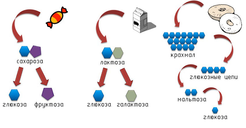 - Дисахаридаза (лактаза, сахараза, мальтаза) расщепляет дисахариды (лактозу, сахарозу, мальтозу) до моносахаридов