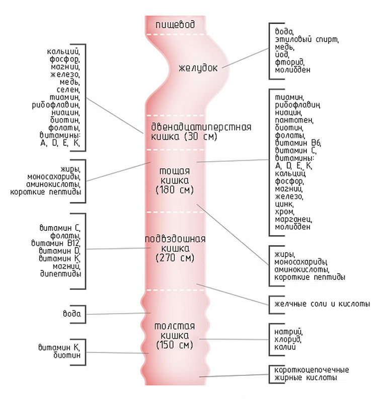 Вода и электролиты — всасываются на протяжении всего желудочно-кишечного тракта, но основная часть — в тонком и толстом кишечнике. Процесс происходит путем осмоса и активного транспорта.